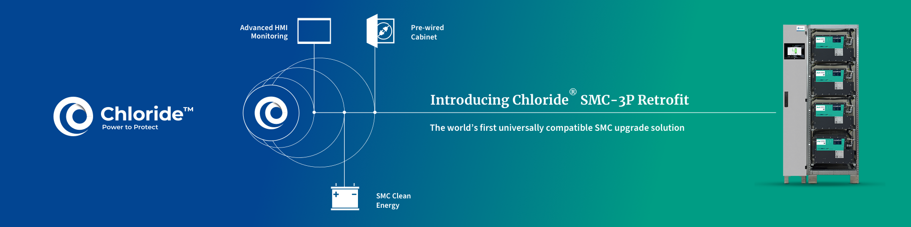 Chloride, l'un des principaux fabricants de systèmes d'alimentation sans coupure (UPS) industriels destinés aux opérateurs de production et de transport d'énergie, commercialise la solution Chloride® SMC-3P Retrofit. Cette technologie révolutionnaire représente une avancée technologique dans la transition énergétique de l'industrie lourde et est l'aboutissement de plus de 5 ans de travail visionnaire du département R&D de Chloride.